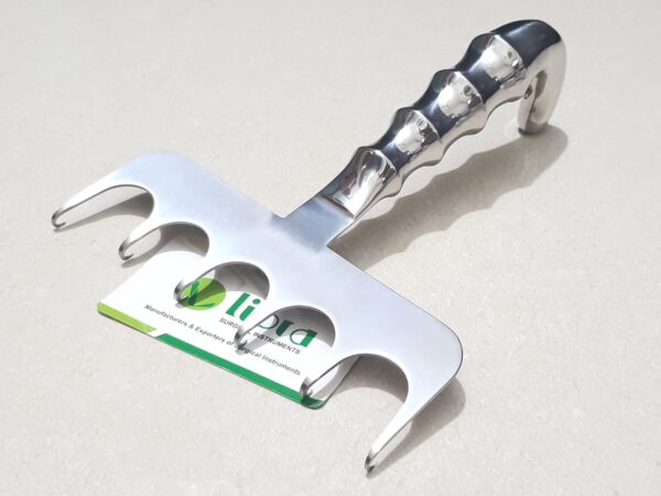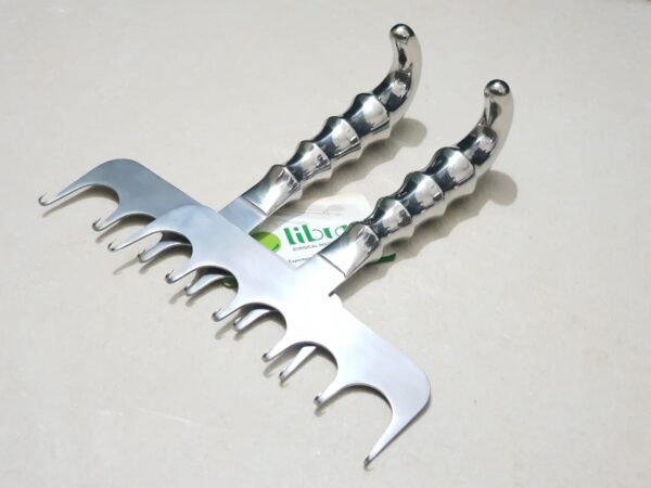LIBRA Brand Yancoskie Abdominoplasty Retractor 19cm is Total Overall Length Size, Features With 6 Sharp Prongs/Hooks and Ergonomic handle reduces hand fatigue. Used in tummy tuck procedures to retract skin evenly. Handcrafted With German Stainless Steel. Blade Finish is Satin With Gold Plated Finger Grip Hollow Handle. Original Pics are Attached