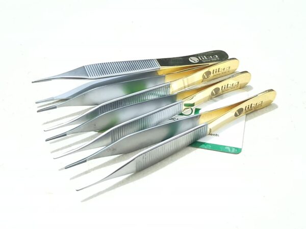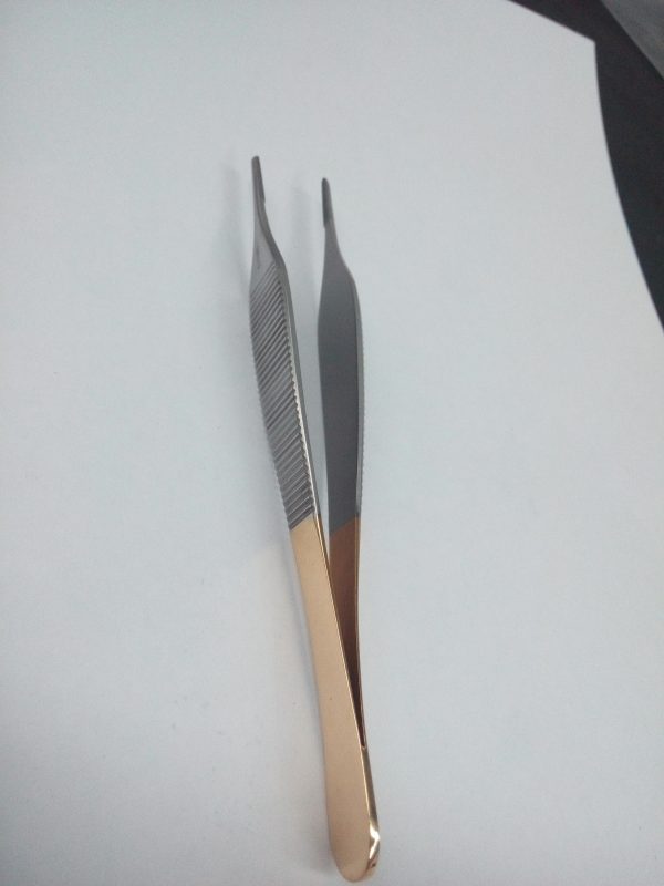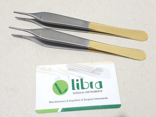 LIBRA Brand Adson Forceps Features Tungsten Carbide Fine tip for gripping needles, suture, and delicate tissues, Useful for removal of fine suture. Handcrafted With Grade German Stainless Steel With Delicate Jaw made from Tungsten Carbide that provides an enhanced service-life and secure Non Slipping grip. Satin With Gold Plated Finish. Original Pics are Attached