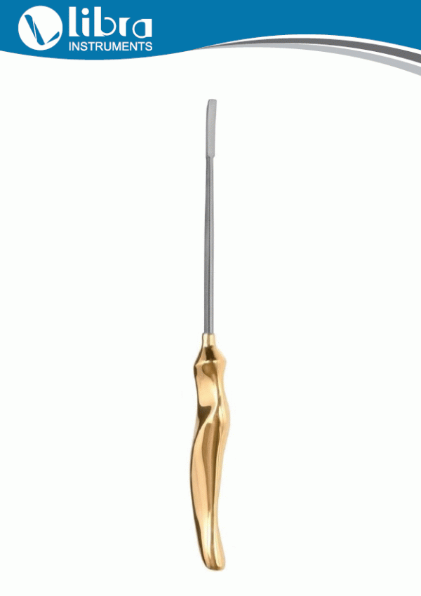 LIBRA Brand Flap Dissector 5mm Tip, Length 9¼”/23.5cm is Total Overall Length Size, Straight, Useful in Facelift Surgery, elevation in continuity of the periosteum off the zygomatic arch. Handcrafted With German Stainless Steel. Satin Finish With Gold Plated Hollow Handles. Original Pics are Attached