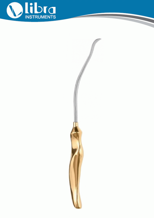 LIBRA Brand Midface Facial Dissector Multiple curves 12mm Blade Width, 9¾”/24cm is Total Overall Length Size, Useful for the separation and elevation of the facial attachments to the masseter muscle. The Endo facelift Tool, Product, instrument, Device have been developed to facilitate new endoscopic aesthetic surgical procedures. Each instrument is shaped to fit facial contours and designed for specific surgical maneuvers. Dissectors are sequentially numbered in order of use for easier identification and feature ergonomically designed handles for greater comfort and control. The versatility of the set allows the surgeon/doctors to perform an endoscopic forehead, facelift or both procedures combined. For dissecting/elevating the lower portions of the forehead, especially the naso-glabellar area. Length of shaft allows easy access to glabellar region. Handcrafted With German Stainless Steel. Satin Finish With Gold Plated Hollow Handle