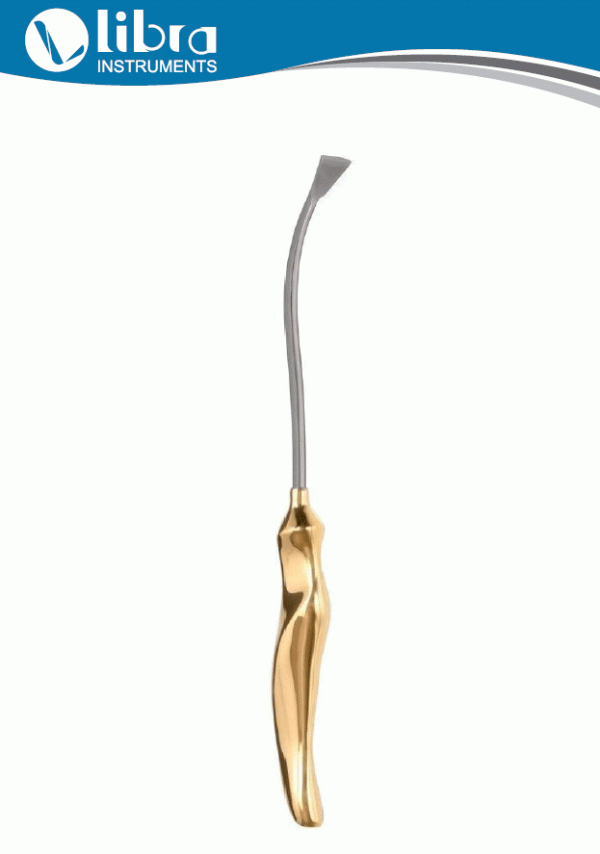 LIBRA Brand Scalp Elevator “S” Shaped 12.5mm Blade Width, Length 9½”/24cm is Total Overall Length Size. Handcrafted With German Stainless Steel. Satin Finish With Gold Plated Hollow Handle