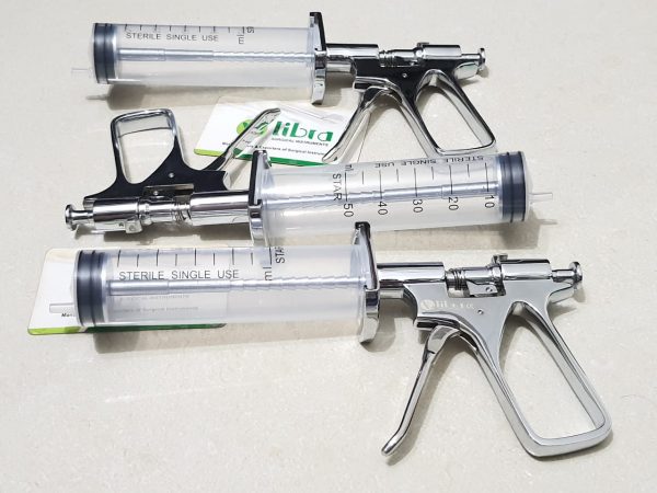 LIBRA Brand Universal Injecting Gun 50cc and 60cc Syringes, The Power Injector Allows The Surgeon To re-inject Soft Tissue Through Large Or Small Diameter Injectors With very Little Effort And Maximum Control. The Universal Power Injector With Hold a 50cc Or a 60cc Syringe. Finish is Chrome Plated. Original Pics are Attached